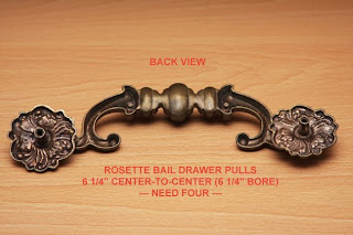 These pulls are called rosette bail pulls and have a 6 1/4" center-to-center (6 1/4" bore between the screw holes). I've looked on Lowe's and Home Depot websites -- the pulls are too small. I've also tried google searches, ebay, and second-hand stores with no luck.