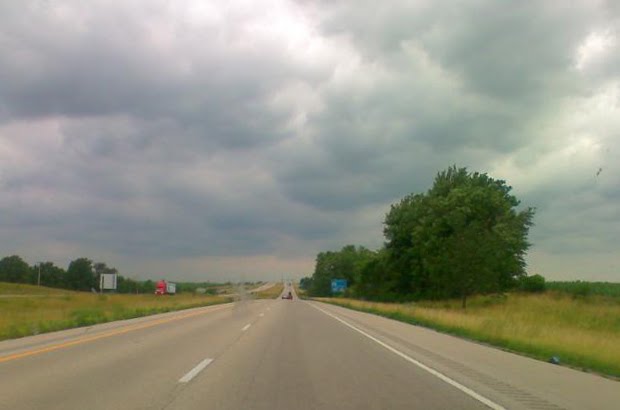 I loaded about 1/2 of my stuff in the car on Saturday night so that I wouldn't have so much to do Sunday morning. Right before I was about to leave on Sunday, a text message came to my phone: "Be Careful. Heavy storms are rollin through." Oh great. Here's what the skies looked like as I made the return trip home: