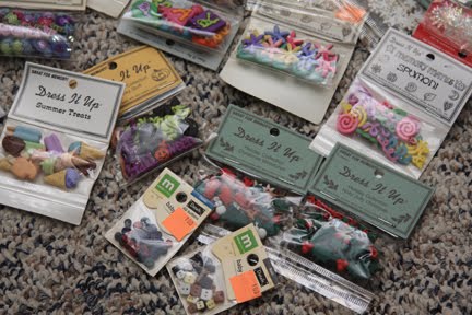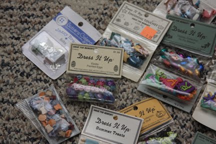 Great finds! That is a really good find on the buttons. What about sewing them, loosely, onto a length of velvet ribbon? That way, you can display them, and then snip them off as needed.