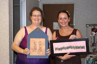 Heather Daly of Monsterbubbles arrived in the morning to give us a trunk show and teach us a class... stitching on screen. Debra H & Karin are checking out the trunk show.