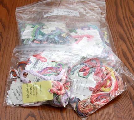 I organized them even farther by putting the floss in quart size ziploc bags alphabetically (A-D, E-J, K-M, etc). Inside each gallon bag was a checklist (from the manufacturer website) of colors available. I checkmarked the ones I have, so I know at a glance and don't have to go digging through the bag only to come up empty handed.