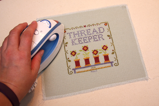 Iron your stitched piece, the finishing fabric, and the lining fabric.  I ironed quite a bit throughout assembly of the Thread Keeper.  Ironing keeps all the pieces nice and flat.
