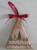 One of the groups I'm in coordinated a Blind Ornament Exchange. No, the ornaments aren't blind... well, maybe they are... I don't know! LOL Each person stitched an ornament, sent it to the coordinator along with a postage paid envelope to send back another a stitched ornament from someone else. Mine was from Gabi in Australia. As I recall, it was Gabi's first time doing a triangle ornie and I think it turned out beautifully. Thank you, Gabi!