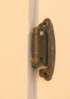 With a heading like that, I bet you're wondering: "What's she going to talk about now?!" LOL What started out as a simple task, turned into SO much more. I decided to re-caulk the shower surround and tub on Friday night. Then I decided since I was already caulking, I might as well remove the old, nasty stuff on the outside of the tub by the linoleum on the floor. Suffice to say that whoever put in the linoleum did a crappy job and in some places there's a gap of 1/2" that needed to be filled with caulk. Even so, it looks 100 times better than it did before.On Saturday, I got the "bright" idea to replace the painted over and starting to rust hinges of the bathroom cabinet. I bought new hinges and took the cabinet doors off. Then decided I couldn't put the doors back on without repainting them (everything in my house needs repainted!). I primered them.